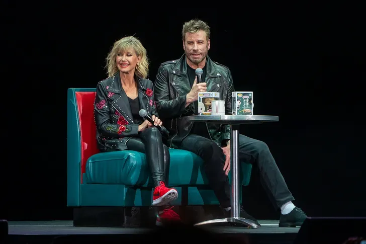 John Travolta en Olivia Newton-John zijn weer even in de huid gekropen van hun Grease personages Danny Zuko en Sandy Olsson voor een film sing-along event in West Palm Beach, Florida.