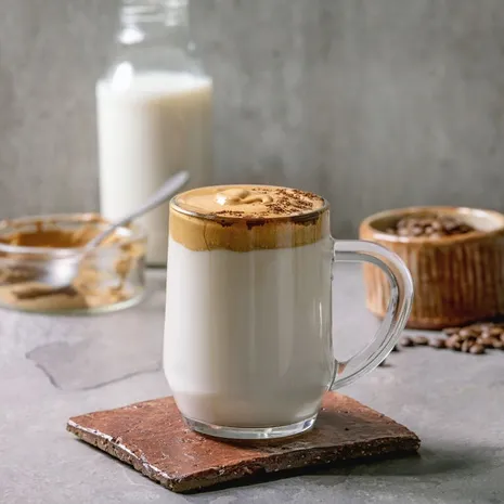 Het recept is simpel: klop gelijke delen oploskoffie, suiker en heet water met een mixer tot een karamelkleurig lobbig, romig mengsel (dit duurt wel even – reken op een minuut of zeven, acht, gewoon volhouden). Lepel dat op een glas koude of warme melk of sojadrank. Je kunt ook experimenteren met matchapoeder en cacao. Het wordt vooral in de middag gedronken - straks even de keukenkastjes induiken voor dit oppeppertje?