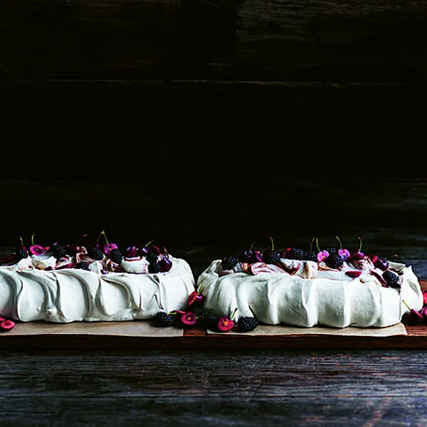 Verlaag de oventemperatuur tot 120 graden en bak de krans 1 uur of tot hij bros aanvoelt. Zet de oven uit en laat de Pavlova volledig afkoelen in de oven met dichte deur. Klop de room in de schone kom van de standmixer tot zich zachte pieken vormen.