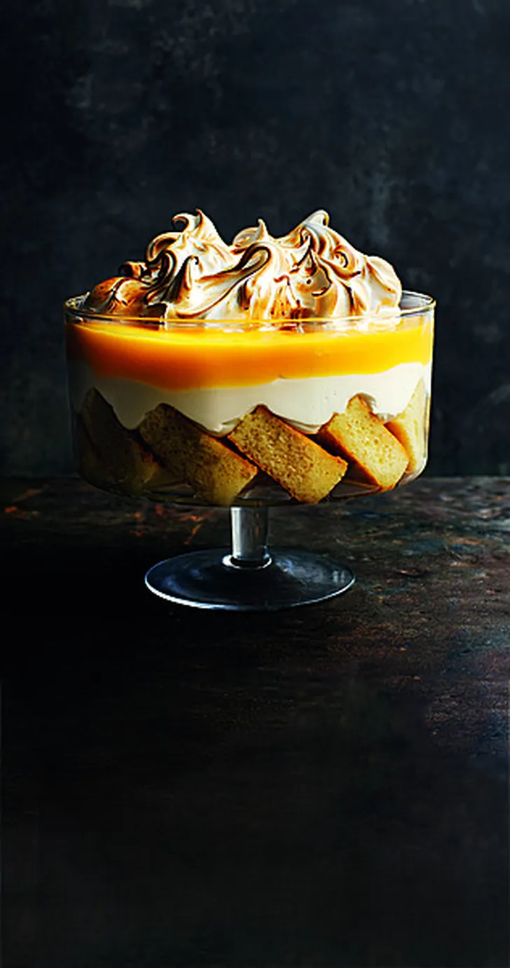 Schep hierover de opgeklopte room en vervolgens de lemon curd. Verdeel daaroverheen royaal de Italiaanse meringue en gebruik een keukenbrander om de meringue een goudbruine gloed te geven. Serveer direct.