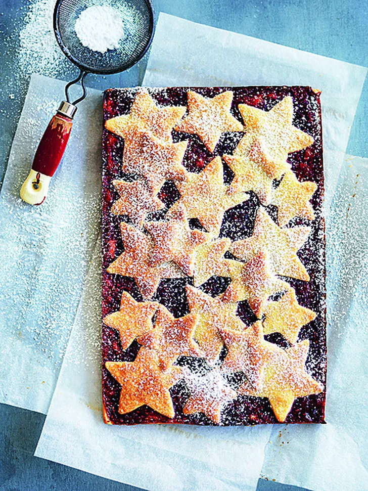 Bestrijk de shortbreadbodem met de jam en leg de sterren erop; laat ze iets overlappen. Zet 20 minuten in de oven of tot de sterren goudbruin zijn. Laat volledig afkoelen in de vorm. Haal de plaatkoek uit de vorm, bestuif met de extra suiker en serveer.