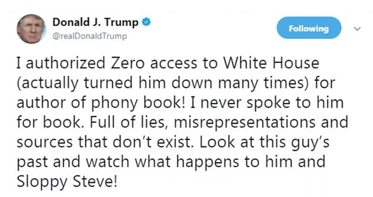 Jounalist Wolff zou anderhalf jaar lang ongehinderd in Trumps kringen hebben rondgelopen en zijn informatie van insiders hebben gekregen, waaronder Steve Bannon, voormalig chief strategist en senior counselor van Trump. Trumps reactie op twitter: