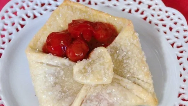 En goed nieuws, het is makkelijk te maken; iedereen krijgt dit smakelijke cadeau in een handomdraai gefikst. Je neemt een lap vers taartdeeg (of bladerdeeg voor een knapperiger, nog makkelijker variant) en snijdt het in een vierkant. Vul het met wat vers fruit of kersenvulling - of waar je de ontvanger maar blij mee kunt maken - en vouw het deeg tot een envelop.