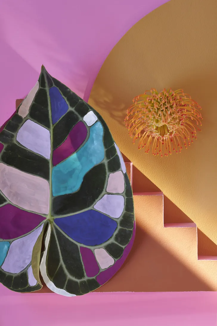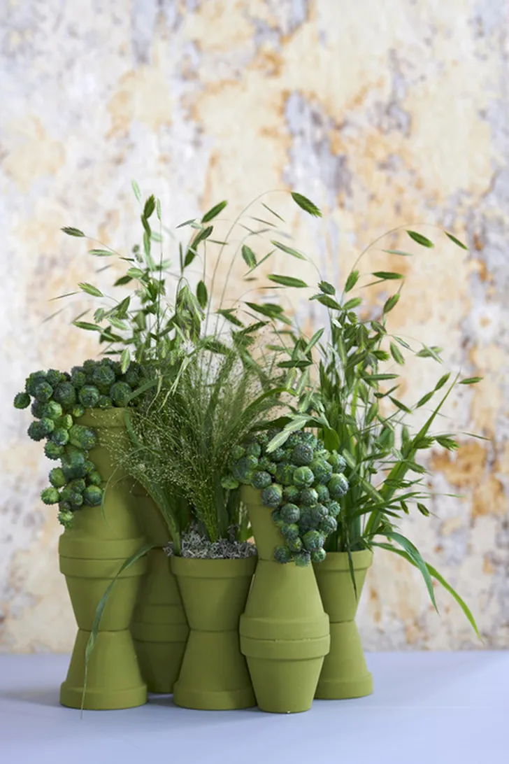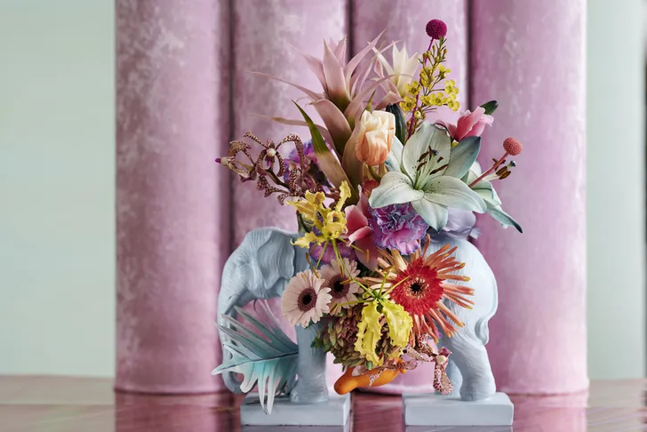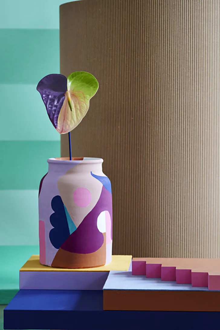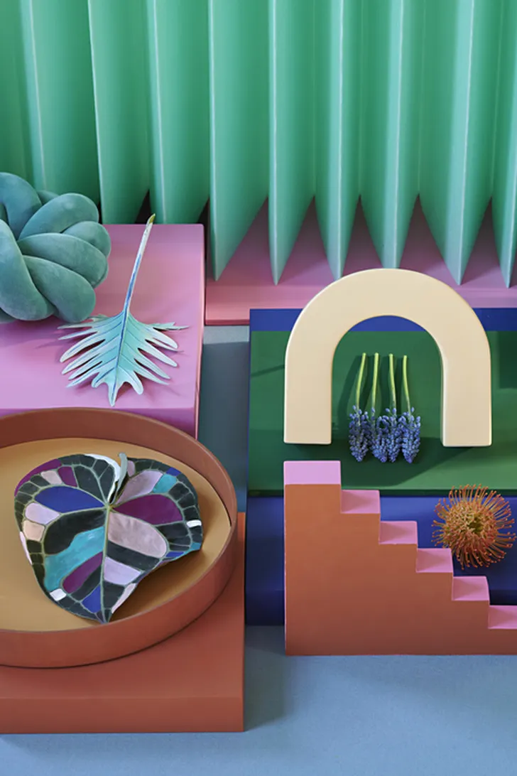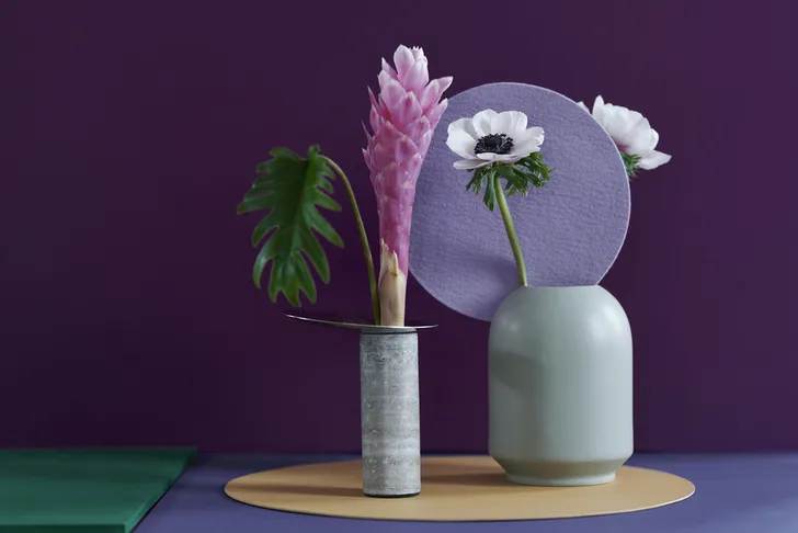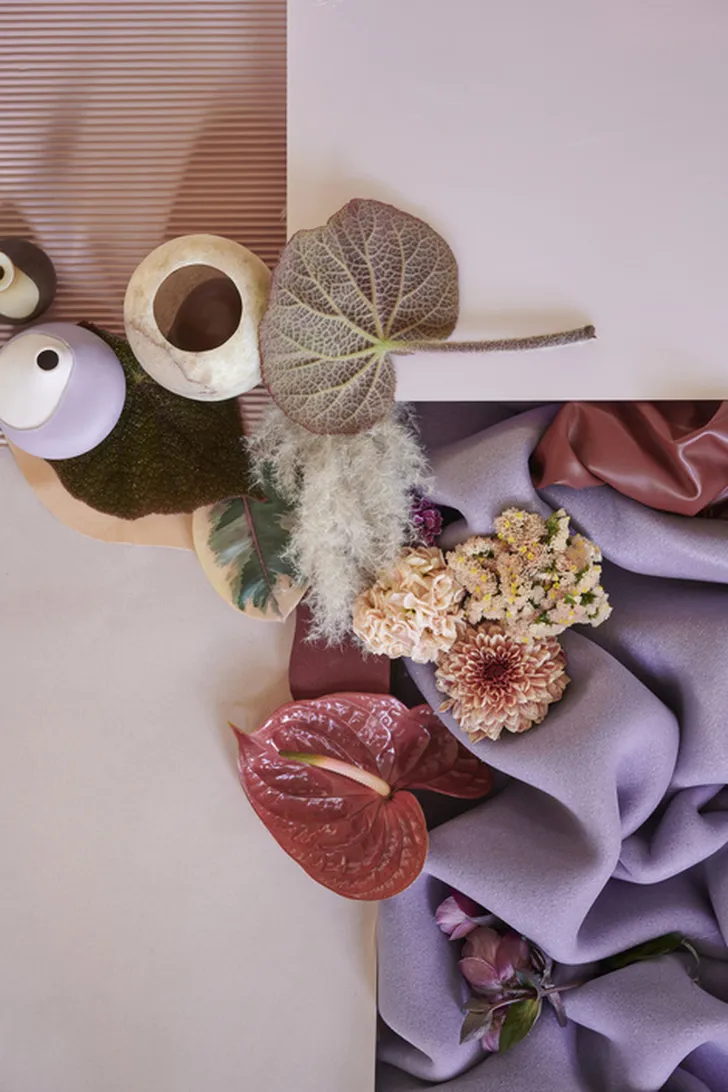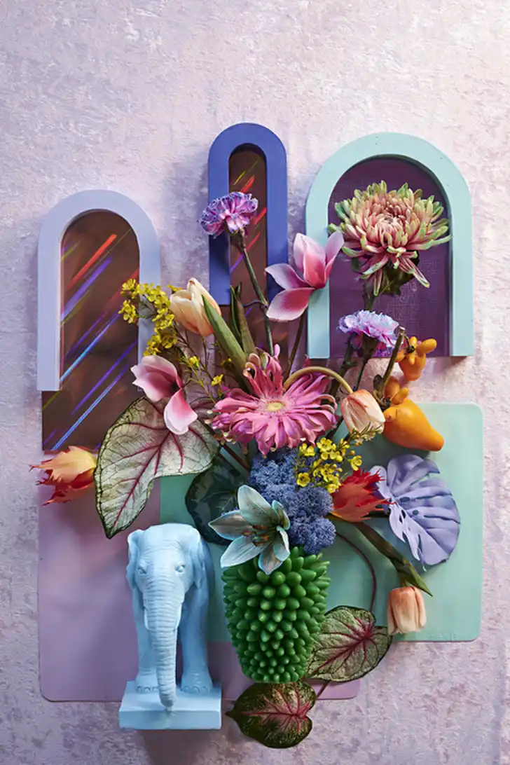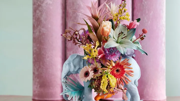 De kleuren zijn verre van bescheiden: zachte pasteltinten maar ook pittige kleuren als geel, terra, blauw en paars. Voor bloemen geldt dat de vaas de vorm van een boeket lijkt te bepalen. Zo ontstaan verrassend nieuwe vormen. Planten hebben binnen deze trend vaak speelse bladtekeningen vol kleurcontrast.