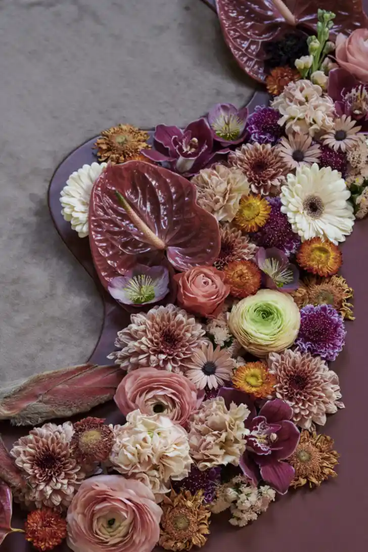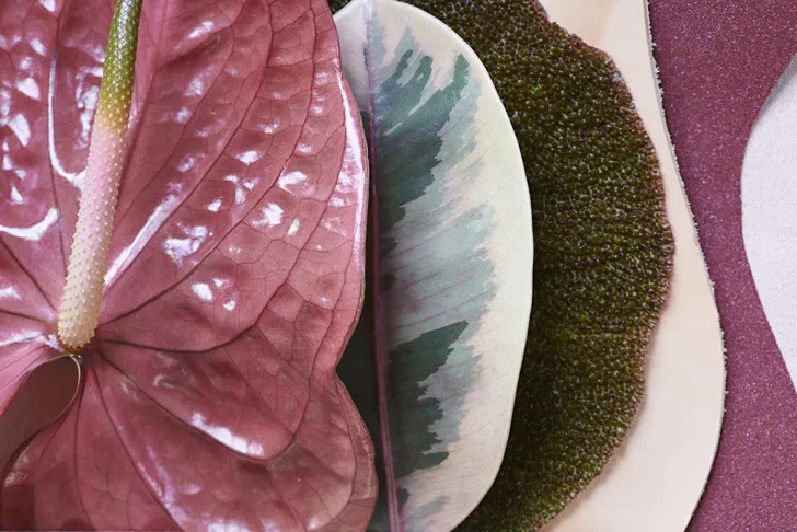 Ook bladplanten zoals de bladbegonia, Ficus en Fittonia spelen een rol in de boeketten. Deze hebben een organische vorm en bestaan uit roze-, oranje- en bruintinten. Ook floating bouquets van orchideeën, Anthurium en pampasgras in één kleurfamilie spelen een hoofdrol in deze trend.