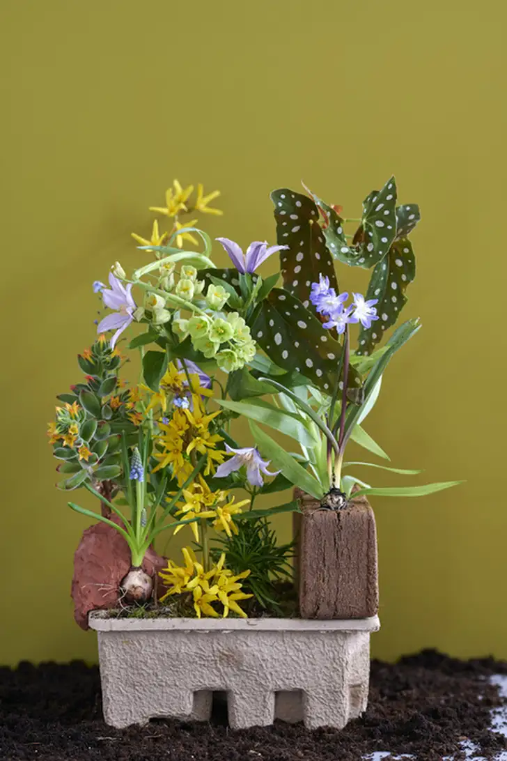 Voeg er hoogteverschillen aan toe en de tuin transformeert in een spannend geheel, waar steeds van een nieuw gezichtspunt te genieten valt. Monochrome kleurvlakken creëer je door gele tulpen, blauw druifje en roze dahlia’s te planten.