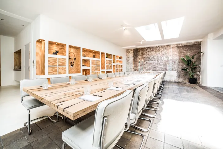 In een ander deel staat een indrukwekkende eikenhouten tafel met veel stoelen. Er komt volop licht binnen door de ramen in het dak. Sta je te popelen om hier ook een keer te brainstormen? Dat kan!
