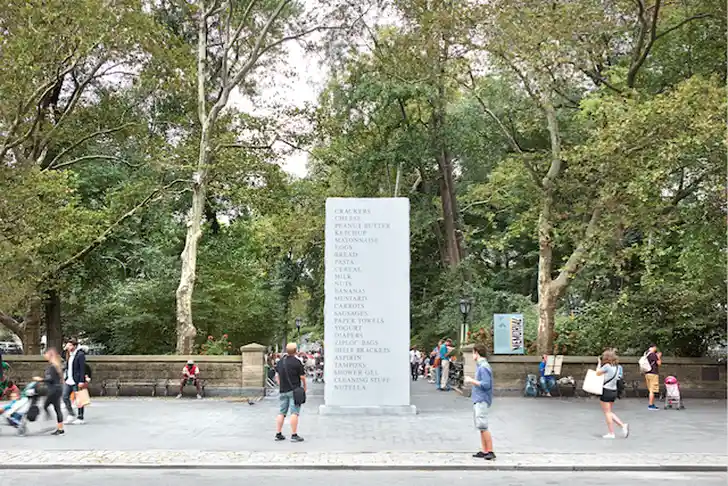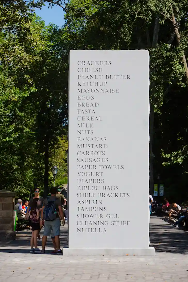 Oké. Wat is het meest kenmerkende van ons dagelijks leven in deze tijd? Het enige document dat kunstenaar David Shrigley kon bedenken is het boodschappenlijstje. Hier maakte hij een standbeeld van genaamd MEMORIAL en zal te zien zijn op de Doris C. Freedman Plaza in Central Park tot 12 februari 2017.