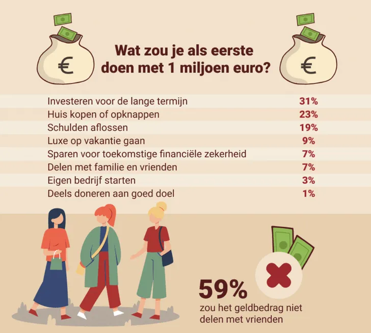 Wat zou jij doen met een miljoen? Die vraag werd aan duizend Nederlanders gesteld door Time2play Media. Maar nog veel interessanter waren de antwoorden op de vervolgvragen, zoals: wil je liever een miljoen, of je droombaan of ware liefde vinden?