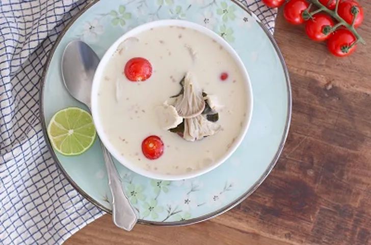 - Schenk de kokosmelk en kippenbouillon bij elkaar in een soeppan.