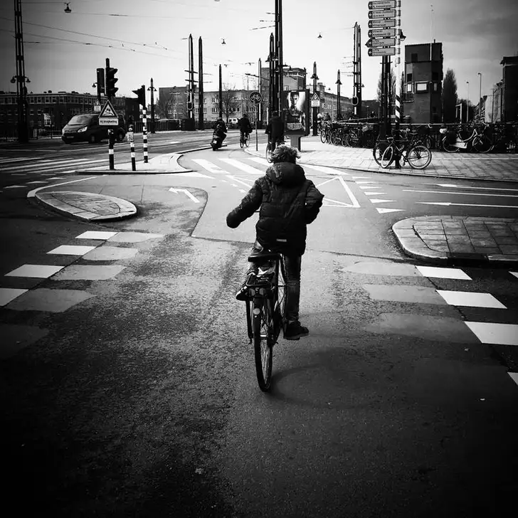 Achter deze stoïcijnse heldin rijdt een middelbare vrouw. Schichtig, zenuwachtig en een tik wiebelig houdt ze het razende verkeer in de gaten. De scooter met haast wordt geïrriteerd nagekeken en bemompeld. Gelukkig heeft híj geen ogen en oren in zijn achterhoofd.