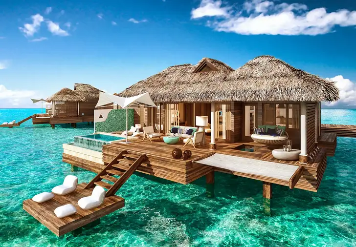 voor koppels die een romantische accommodatie zoeken, zijn de spectaculaire watervilla’s van het Sandals Royal Caribbean Resort in Montego Bay in Jamaica het ultieme paradijs. Deze villa’s staan letterlijk in de turquoise Caraïbische Zee en hebben zelfs een glazen vloer in de slaapkamer waardoor u vanuit bed naar de onderwaterwereld kunt kijken. Iedere villa beschikt over een zwembad op het terras, een hangmat die boven de oceaan hangt, een apart op zeeniveau gelegen zonneterras en een privé butler van de Guild of Professional Butlers.