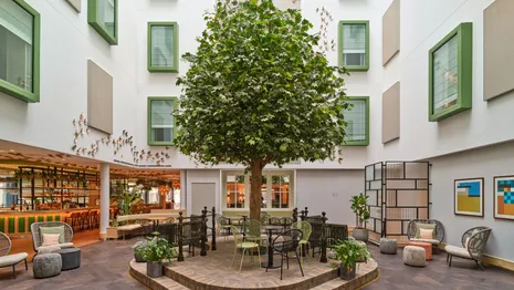 Een fijn viersterrenhotel aan de Kneuterdijk, in het Koninklijk Kwartier. Werken gaat er top, in Botanica Kitchen & Bar waar je natuurlijk ook fijn kunt lunchen. In de zomer neem je lekker plaats op het terras of in de binnentuin (hoofdfoto). En klap je uiteindelijk je laptop dicht, dan wandel je zo de stad in of pak je de tram naar het strand.
