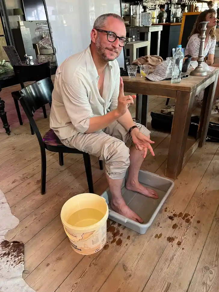 Toen ik op het strand mijn voeten had verbrand (lange shoot, druk bezig, even niet opgelet...) kreeg ik meteen een teiltje water. Tel daar de uitstekende koffie bij op en je weet: dit is een aanrader.'