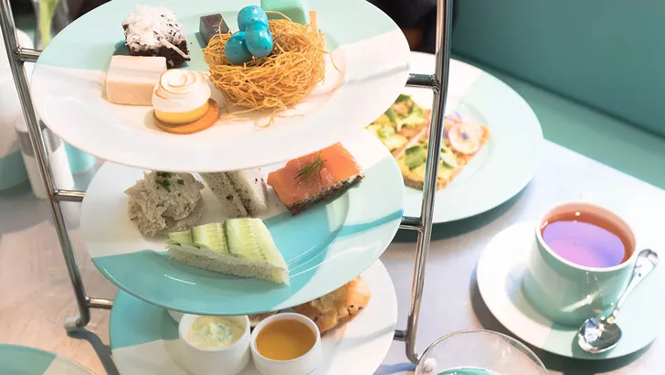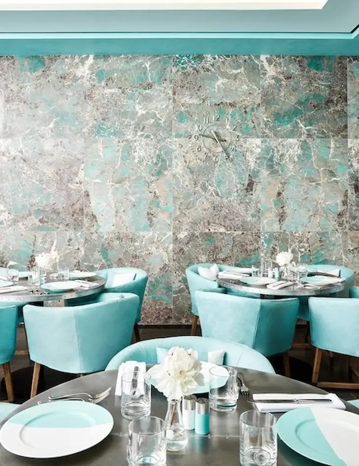 Het buitengewoon Instagrammable café bevindt zich in het souterrain van het warenhuis in Knightsbridge en is tevens een showroom voor homeware en home decor van Tiffany's.