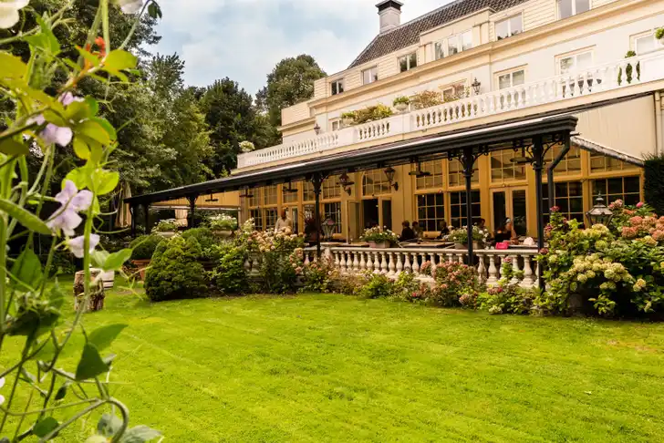 Op het terras van een historisch rijksmonument zit je volop tussen het groen van het park en word je culinair in de watten gelegd. De wijnkaart is trouwens ook bovengemiddeld fijn hier.