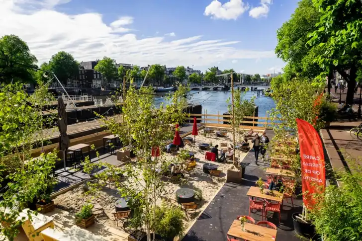 Een terras met stadsstrand bij het Koninklijk Theater, met volop zon, fijne gerechten en natuurlijk de mooiste locatie aan de Amstel met uitzicht op de magere brug.