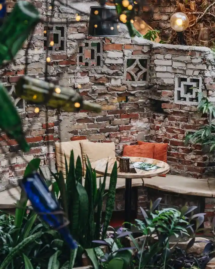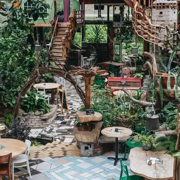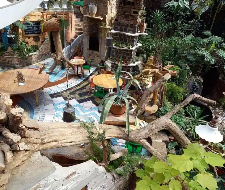 Restaurant Het Paradijs ziet er ook een beetje zo uit: exotisch, veel planten, riet, waterpartijtjes – het is weer eens wat anders dan het eeuwige 'urban industrial' dat je nu overal ziet.