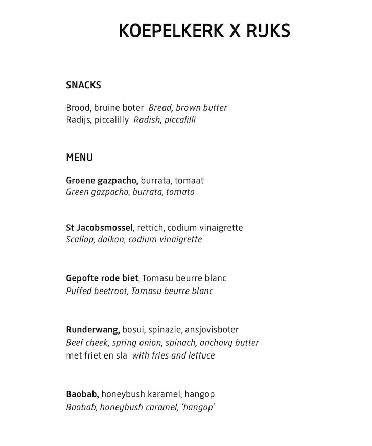 Op RIJKS x Koepelkerk-avonden wordt er een speciaal vijfgangenmenu geserveerd met RIJKS-klassiekers zoals Biet Tomasu beurre blanc en Sint Jakobsmossel met codiumvinaigrette. Het menu wordt begeleid door mooie wijnen, zorgvuldig geselecteerd door sommelier Max van Bockel.