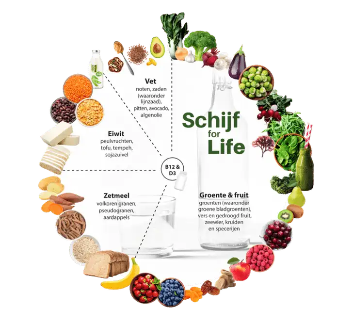 Met de Schijf for Life, in goed Nederengels, krijg je meer vezels binnen en haal je calcium uit bijvoorbeeld boerenkool. Wie (veel) vlees eet krijgt veel meer eiwit binnen dan nodig is en dat belast de nieren onnodig, dat wordt vervangen met peulvruchten en sojaproducten.