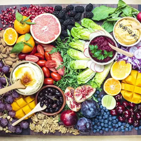 ...met vlakken voor groente & fruit, vet (noten, zaden, avocado), eiwit (peulvruchten, soja, tofu) en zetmeel in de vorm van granen en aardappels. Het advies is om daar vitamine B12 en D3 bij te slikken, om tekorten te voorkomen.