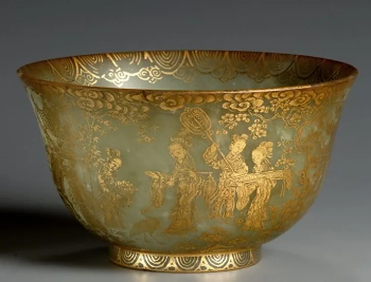 Edward Pranger Oriental Art Jade kom met vergulde decoratie China Qianlong merk en periode (1736-1795) Diameter 11 cm