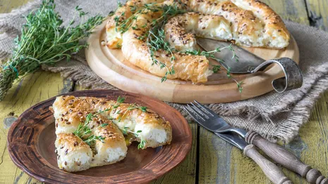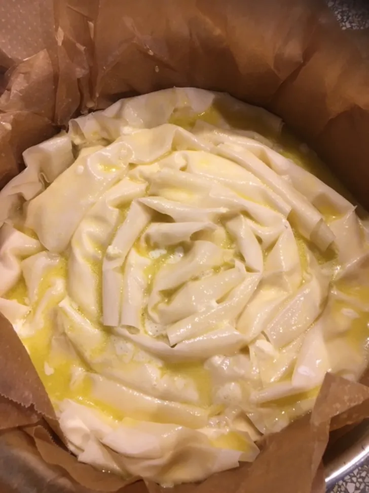 Rol het filodeeg uit. Doe de roomkaas in een spuitzak en spuit een rand roomkaas op de rand van het filodeeg. Rol het filodeeg op tot een lange rol. Leg opgerold in het midden van een ronde bakvorm. Drapeer er steeds nieuwe rollen omheen totdat de bakvorm vol is.