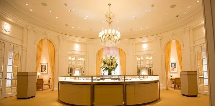 De Princess Grace Salon, wat vroeger de oude ballroom was, bevat alle diamanten en verlovingsringen. De ovale kamer heeft zo prachtig natuurlijk licht, dat elk item perfect tot zijn recht komt. Over de prinses van Monaco: de oorspronkelijke verlovingsring van Cartier van 1956 wordt tot 15 oktober tentoongesteld.