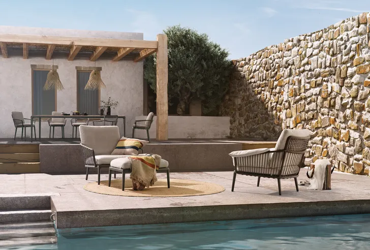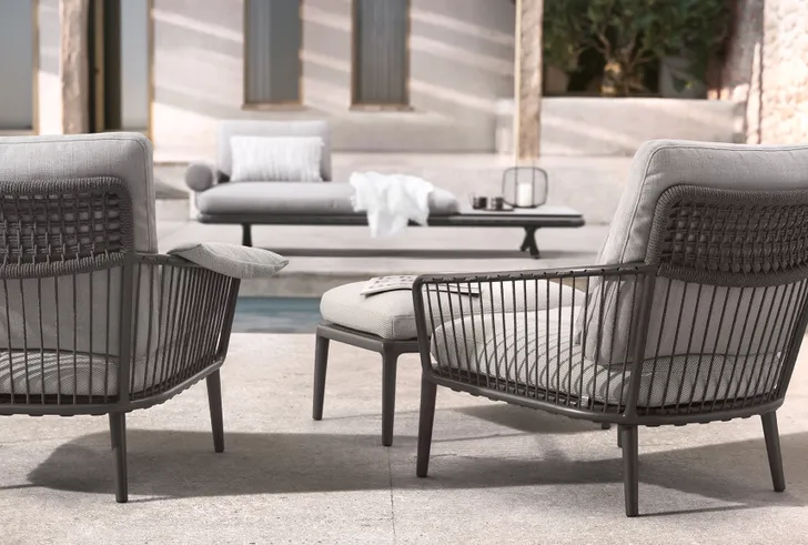Naast de banken bevat het outdoor programma ook een salontafel, tafel, een fauteuil en een stoel.