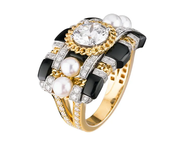 Tweed de Chanel is volledig gewijd aan de stof waar Coco zo dol op was en ziet eruit als geweven onyx, parels, diamanten en goud. De sieraden zijn meesterwerkjes: harde materialen die eruit zien alsof zacht zijn. Dit is de Tweed Contraste ring.