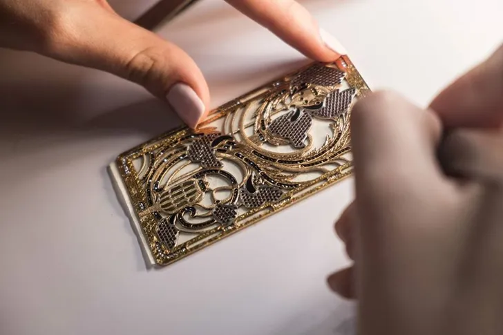Naast goud en andere edelmetalen worden heel kleine edelstenen gebruikt om de afbeeldingen te maken.