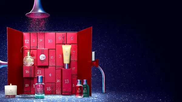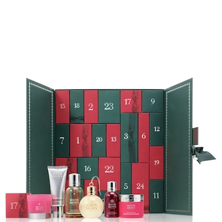 De kleuren en geuren van Kerstmis bij Molton Brown. Wie wil deze kalender nou niet van de 'connaisseur' van bath, body en beauty. De kalender van bestaat onder meer uit vier body lotions (50 ml), twee mini kaarsen (30 g elk), twee body scrubs (50 g), een Indische kers shampoo (50 ml), een hair mask (50 g), een eau de toilette (50 ml), een eau de toilette rosa absolute (50 ml) en een vintage kerststal (75 ml). Je koopt hem hier voor € 198,00.