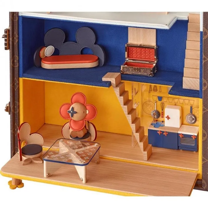 Omdat een poppenhuis niet zonder poppen kan, heeft Vuitton er twee Vivienne's bijgedaan, de mascotte geïnspireerd op de bloem in het logo. Weer ingepakt zit alles in een passend koffertje.