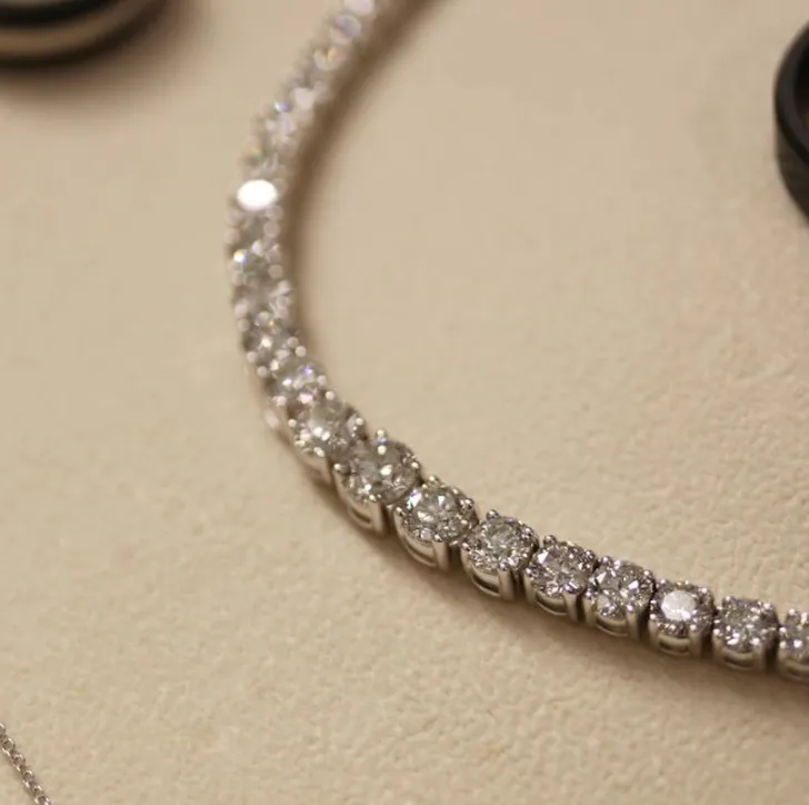 Het schone, moderne hightech imago helpt daarbij, net als de prijs: een lab-flonker is gemiddeld 30 tot 40 procent goedkoper dan een natuurlijke (deze ketting met Lab Diamonds is van Ada Diamonds).