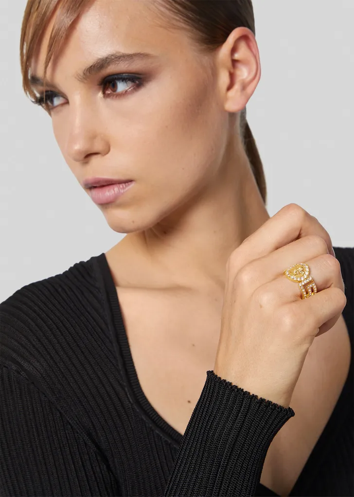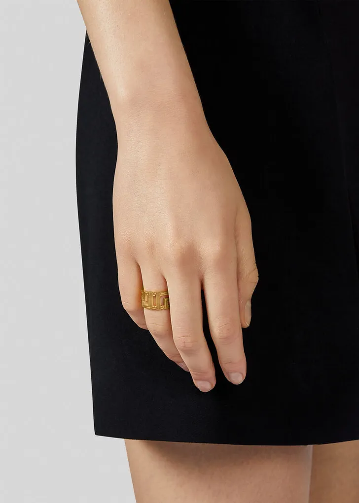 Voor de feestdagen heeft Donatella dan ook een collectie samengesteld in louter geel goud, met verrassend betaalbare stukken, zoals de Grecamania ring (€ 190)…