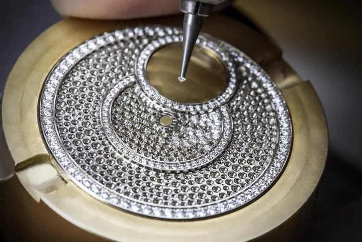 Alle Egérie horloges zijn bezet met diamanten, de duurste heeft er 292 op de kast, nog eens 510 op de wijzerplaat en twee gespen met nog eens 21 diamanten op elke gesp. Très chic, très prijzig...
