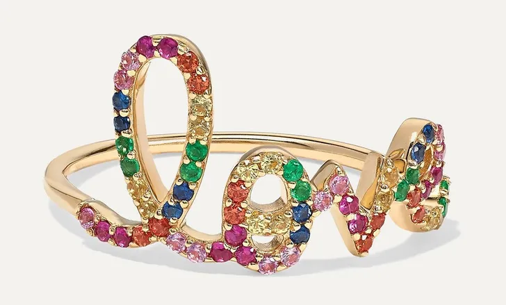 Sydney Evan Love-ring met robijn, amethist en smaragd (Net-a-Porter € 1128)