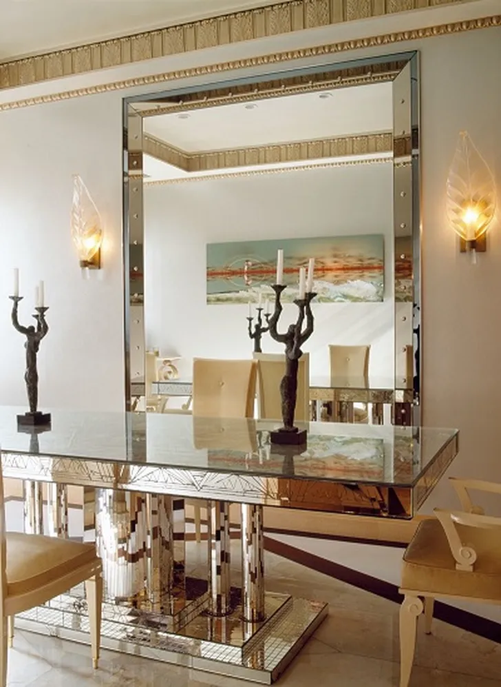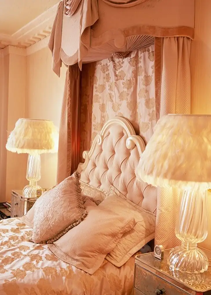 De slaapkamer is zacht roze met weelderige tapijten en art-deco accessoires.