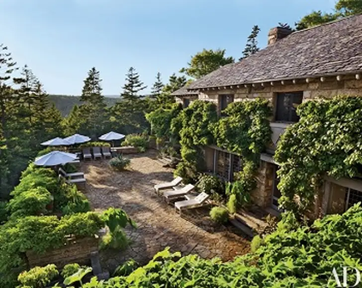 Martha poseert hierboven voor het huis met haar chow chow Ghenghis Khan en Franse bulldogs Sharkey and Francesca bij Skylands in Maine dat werd ontworpen door Duncan Candler.