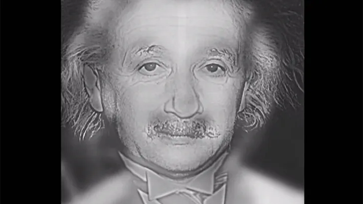 Van dichtbij kan het ook fijne details eruit halen, zoals Einstein’s snor of rimpels. Maar als er een afstand ontstaat of als het zicht minder goed is, ontstaat er als eerst een wazig beeld, zodat de details van Einstein wegvallen en je Marilyn Monroe te zien krijgt.’