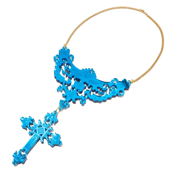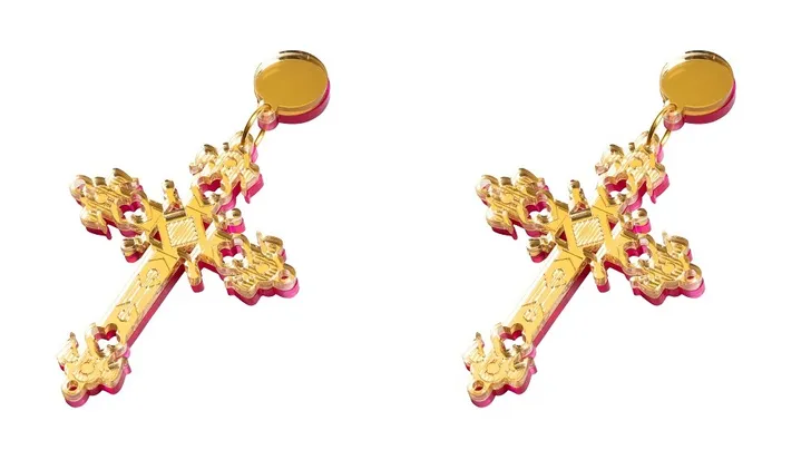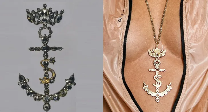 Rijkje Vermeulen, die in al haar designs gebruik maakt van symboliek, maakte een moderne interpretatie van de adelaar, het kruis en het anker, uitgevoerd in metallic en transparant perspex, verfraaid met goudkleurig metaal. Links het origineel, rechts een Hermitage X Rijkje.
