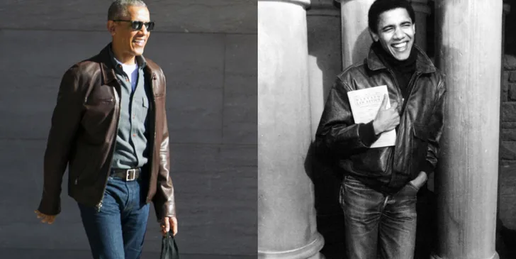En wat zijn kleding betreft, grijpt hij weer terug naar de succes-look uit zijn studententijd op Harvard (onderstaande foto rechts stamt uit 1992), inclusief kek leren jack.