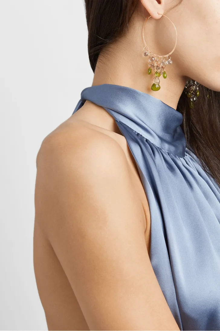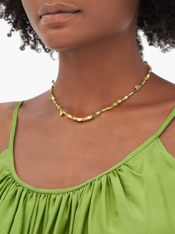 Katerina Makriyianni’s groene ketting is gemaakt van peridot en jade, pareltjes en verguld zilver (Matches Fashion € 149)