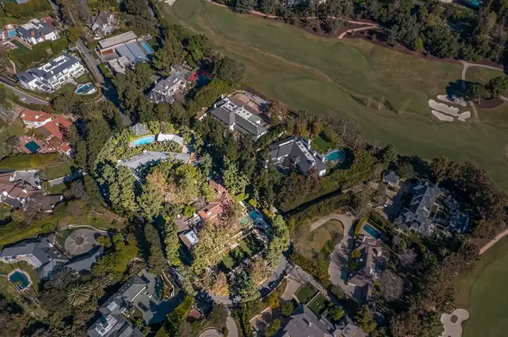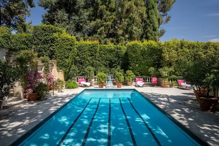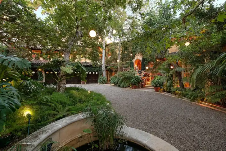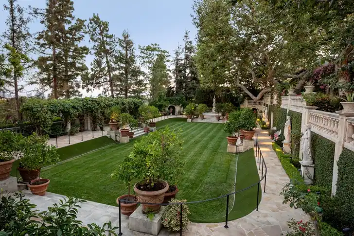 Je vindt er een zwembad, een spa in een grotto, diverse fonteinen, gemillimeterde gazons en bijzondere bomen, zodat het bijna een arboretum lijkt.
