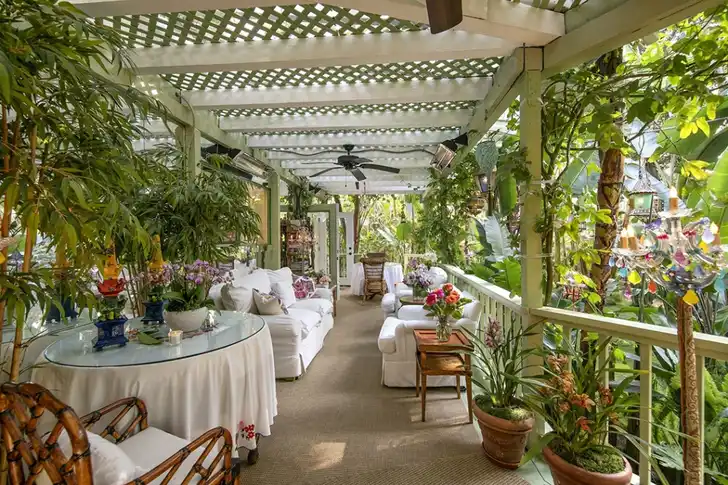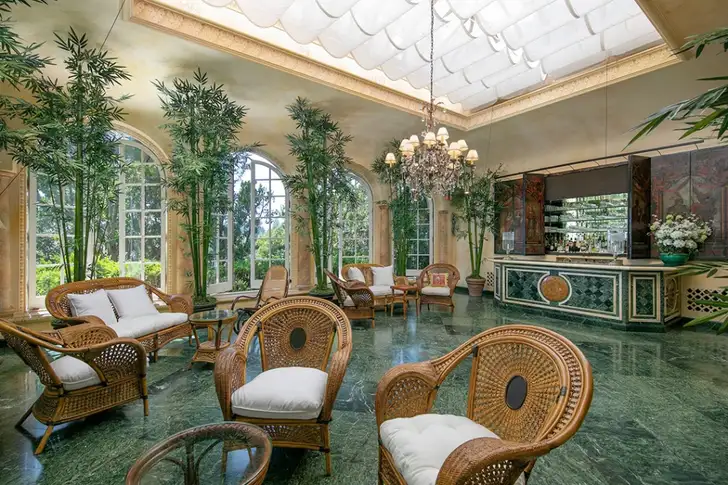 Het huis heeft een orangerie, een kleine salon, een eetzaal die ook weer naar de tuinen leidt, een bibliotheek en een ontbijtkamer met antieke spiegelpanelen die zijn geïnspireerd op die van Caffè Florian in Venetië.
