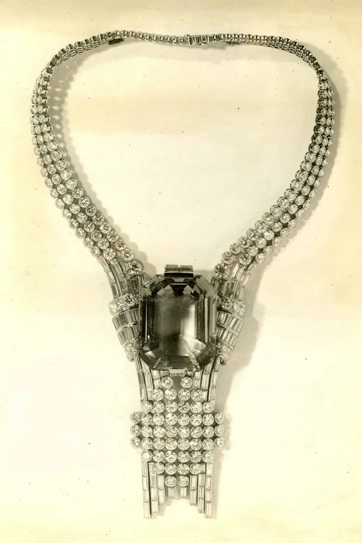 Het ontwerp is een remake van een collier dat in 1939 werd gemaakt voor de toenmalige wereldtentoonstelling. Daarin was een aquamarijn het stralend middelpunt.