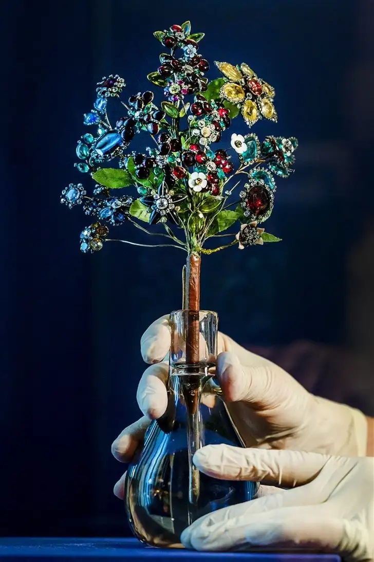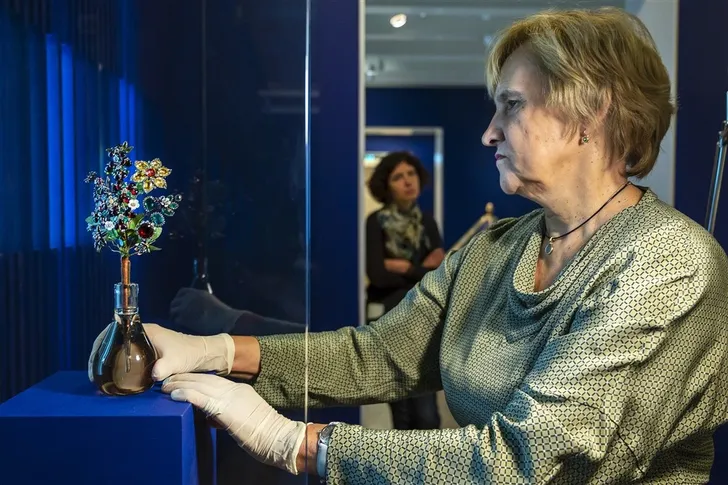 Het betreft een juwelenboeket met zo’n 400 briljanten, meer dan 450 kleine roosgeslepen diamanten, blauwe en gele saffieren, robijnen en smaragden. Het krijgt een prominente plek in de tentoonstelling, in een betoverende schatkamer met de meest uitbundige juwelen die de Hermitage St.-Petersburg rijk is.