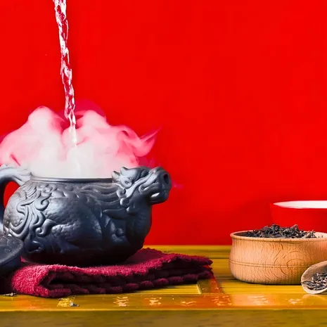 En die naam? Da Hong Pao betekent Groot Rood Gewaad. De zieke moeder van een keizer knapte zo op van een kopje, dat de keizer rode mantels naar de theeplantage liet sturen om de planten mee te beschermen. Wat precies die medicinale waarde is, daar is nooit serieus onderzoek naar gedaan – het is de Haarlemmerolie van China, schijnbaar goed voor alles, van diabetes tot wintertenen.