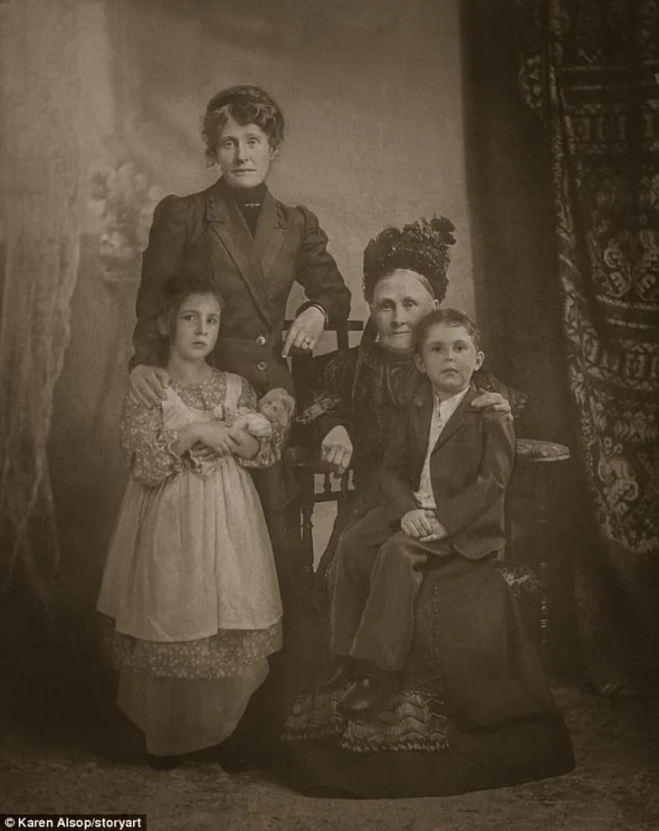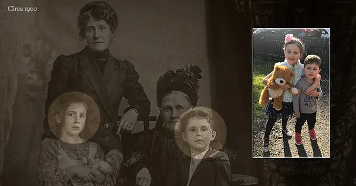 Kunstenares en moeder van twee kinderen, Karen Alsop, zette de foto onlangs online en haar mailbox stroomde vervolgens vol met berichten over hoeveel de kinderen op de oude foto lijken op het kroost van Karen zelf, Jazzlyn en Asher. Uren nadat ze de foto met de wereld had gedeeld, liet Karen weten dat het een samengestelde foto was: ze had haar kinderen in de foto 'gefotoshopt' (maar dan nóg nauwkeuriger) met hun voorouders, waardoor het beeld bijna een unieke reis door de tijd lijkt.