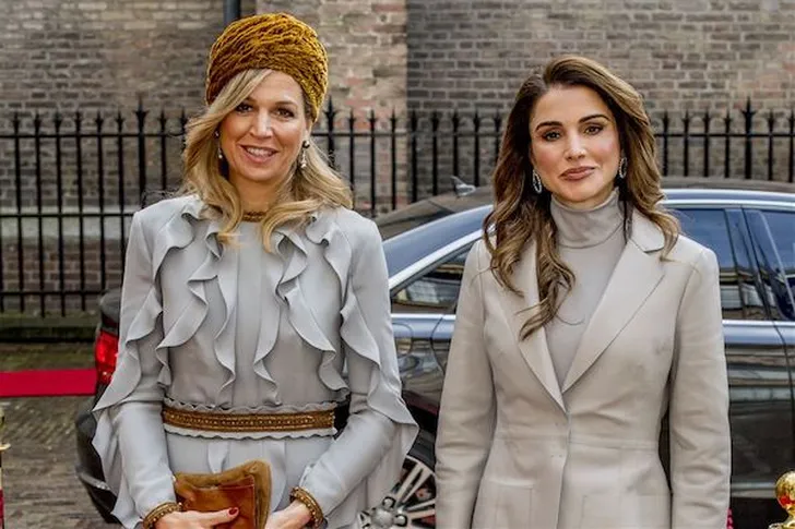 De beide koninginnen leken onderling het kleurenpalet te hebben vastgesteld op grijs (met een vleugje bruin erdoor voor Rania). Het kán vrolijker, maar met twee van zulke beauty’s zit je natuurlijk altijd wel goed.